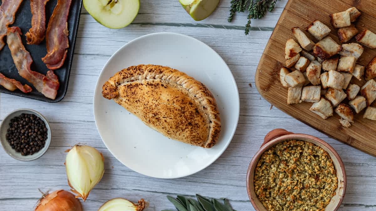 Each D-shaped pasty is hand-crimped and generously filled with tender pork, savoury smoked bacon, and a rich sage & onion stuffing — balanced perfectly with sliced potato, sweet Bramley apple, and onion. The filling is gently seasoned with a comforting blend of sage, thyme, and traditional herbs, bringing out the warm, rustic flavours of a Sunday roast. Ingredients:-